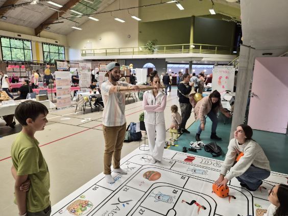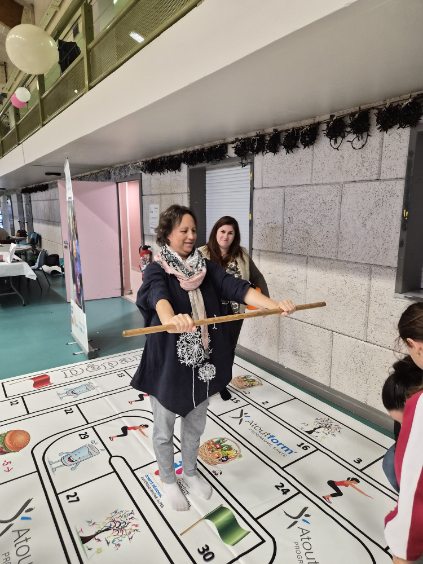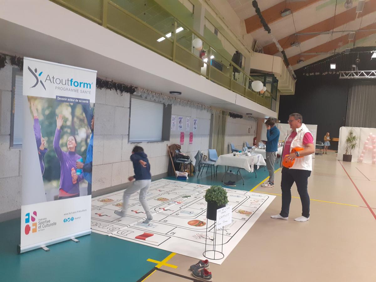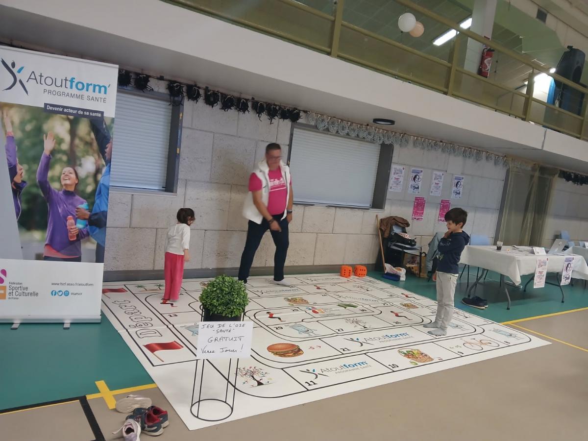 Animé par Gilles Koch, président de l'association Gym Club de Montalieu, une soixantaine de personnes ont eu l'occasion de découvrir le jeu de l'oie géant, mis à disposition par le CR AURA. Les objectifs étaient de permettre aux visiteurs du salon de s’amuser en prenant conscience de l’importance de faire de l’activité physique, mais aussi d’avoir de bonnes pratiques dans la vie quotidienne (alimentation / hydratation / déplacements…).
