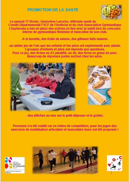 Le samedi 17 février, Geneviève Laroche, référente santé du Comité Départemental FSCF de l’Ardèche et du club Association Gymnastique Cheylaroise a mis en place des actions en lien avec la santé lors du concours interne de gymnastique féminine et masculine de son club.